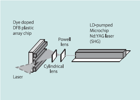 Integratable and disposable solid-state dye lasers with a distributed feedback waveguide structure were studied. We fabricated the coupling of a methacrylate copolymer waveguide and similar substrate and demonstrated primitive fl uorescence detection. We also developed laser integration on a beam-shaper with an optical fi ber for fl uidic chips of polydimethylsiloxane.