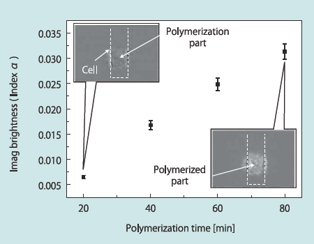 Figure 11 shows the experimental setup for the monitoring with a DFB laser chip that could operate at λ(1,2,3). The laser array was pumped with a LD-pumped microchip Cr:Nd:YAG at a repetition rate of 100 –1000 Hz, and the laser output was injected into a sample cell. The transmitted laser output was measured with a CCD camera, and recorded as a 2D-image. Subsequently, the intensity image of a was calculated and analyzed. Figure 12 shows a typical example of experimental results. Since the sample was stirred during the polymerization, the a intensity as almost uniform in the cell, and the image intensity became brighter with increase in the polymerizing time as shown in Fig. 12. Based on these results, the integrated laser is useful for such an application that requires several specified wavelengths.