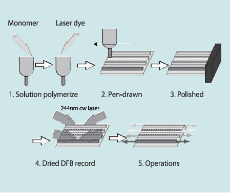 Fig. 1にプリンタブルプロセスを示す。これまで高分解能ディスペンサー( 武蔵エンジニアリング、ML-5000XII)と細線描画用SUSニードル(岩下エンジニアリング、PRN0.06、内径0.06mm)を組み合わせたロボット描画装置を利用して、断面幅 60µm〜120µmの導波路直接描画を行ってきた、我々が開発した無溶媒プレポリマーペン描画法(以降ペン描画と呼称)では、高粘度状態のポリメタクリル酸メチル(PMMA)と未重合のメタクリル酸メチル(MMA)の混合状態の「プレポリマー」を作製し、これに色素を混合してペン描画に利用する。描画後のポストアニール(72℃、120 min)によりMMAを蒸発あるいは重合させて固化を完了し、その後回折格子を記録することで分布帰還構造(DFB)を作製する6)。導波路は縦シングル横マルチモードにすることで出力を増やす構成になっており、膜厚は3〜5 µmとなるが、膜厚が一定でないとDFBの発振スペクトル幅が拡がったりASEなどによる広帯域な成分が増大したりする。