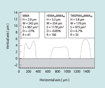 微小ストライプの描画後固化において、低粘度溶液はマランゴニ対流が支配的になり、断面プロファイルがM字型に、高粘度溶液では∩字型となる。しかし、ペン描画法では、導波路の屈折率制御にも利用するメタクリル酸2-ヒドロキシエチル(HEMA)との共重合プレポリマーのブレンド比率を調整することで、両者の中間点の台形型の断面プロファイルを得ることが可能である。この場合、導波路の中央部分には厚さの変化がないフラットトップとなり、良好なレーザースペクトルを得ることができる。