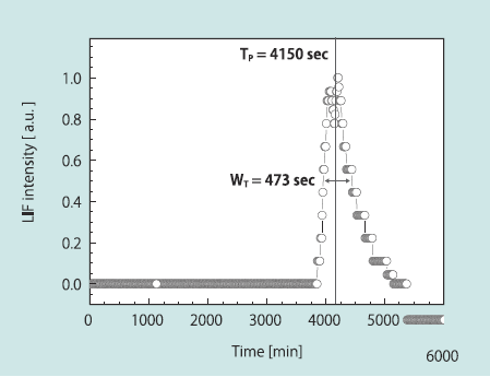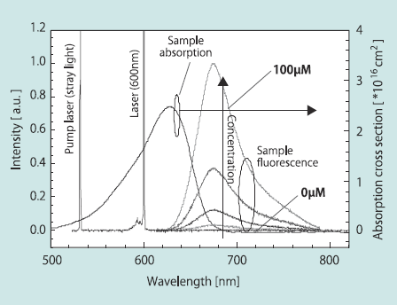 Fig. 6は一つのレーザーのスペクトルと、それによる蛍光のスペクトルである。レーザー光は600 nmに同調してあるが、励起光である532nmも観測されている。ノイズとなるのは蛍光の波長域700nm付近まで伸びているレーザー導波路からの色素蛍光(ASE)であるが、色素濃度の調整とDFB構造を強めに作製する事で、レーザーピーク強度の10-4程度まで抑える事に成功している。濃度を変えて計測した結果、背景光レベルが200nM相当であり、背景光の除去の工夫がまだ必要であるものの、初めて組み込みレーザーによるLIF(Laserinduced fluorescence)計測に成功した。