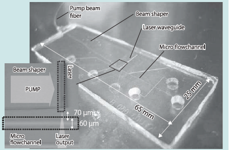 作製例の写真をFig. 10に示す。写真中央には rhodamine 6Gを利用したDFBレーザーが埋め込まれており、レーザーへの励起光入射は光ファイバからビーム成型フィルムを経由してチップ外への光の漏れが無いように行われている。組み込まれたレーザーの長さは5 mm、膜厚は3 µmでクラッドとの屈折率差は0.0015程度に設計した。Fig. 10の左下はレーザー出力部とマイクロ流路の結合部の顕微鏡写真であり、レーザーと流路の距離は70µmとし、レーザー出力が流路と鎖交する様にアラインメントを調整している。レーザー導波路の屈折率設計はコア1.495、クラッド1.493となるよう、共重合ポリマーのHEMA添加率をそれぞれ5%、2.5%とした。コア厚は約3.5µmである。周囲のPDMSは屈折率が1.408でこれもビーム成型フィルムではクラッドとして機能する。