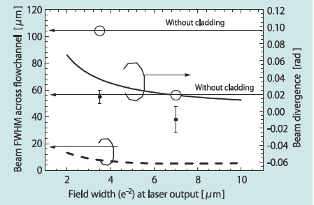 Fig. 11にクラッドによるビーム広がりの抑制の結果を示す。実測ではレーザーを無固化のPDMS中で動かし、流路との距離を変えながら流路側壁の散乱光を顕微鏡CCDカメラ(Nikon eclipse Ti)で観測し、画像処理後ガウシアンフィットしたビームプロファイルから半値幅を求め、ビーム広がり角を求めた。クラッドによる広がり抑制層がない場合、コア層厚3.5 µmに対して広がりは95 mradであった。対して、クラッディングを施したレーザーは10〜19 mradが観測された。Fig. 11に計算によるガウスビーム広がりを示すが、計測結果(○マーク)から出射時のビームフィールド全幅(e-2)は7µmと見積もられ、コア厚は3.5µmより大きくはみ出させることに成功している。対して、広がり防止がない場合、非対称導波路の為か広がりが大きく3.5µmフィールド幅の計算結果とも合致しない。一方でビーム絶対幅の観測結果(●マーク)は共に同様の理論計算(破線)より20µm近く大きな値が得られている。これは観測系の分解能の問題などが考えられるが、ビーム広がりを抑える事で流路に鎖交するビーム幅を、ほぼ30µm一定にできた.