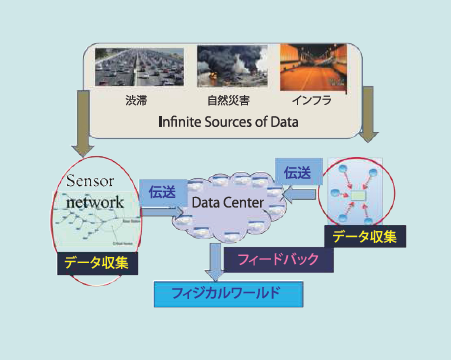 このグループでは、半導体が産み出すビッグデータ・CPSの実現(図1)を目指している。具体的には、図2に示すように、データを継続的に収集するためのバッテリーレスセンサノード、収集した膨大なデータをデータセンターまでに伝送する超高速(10GBPSを超える)の無線システムの研究開発を行っている。