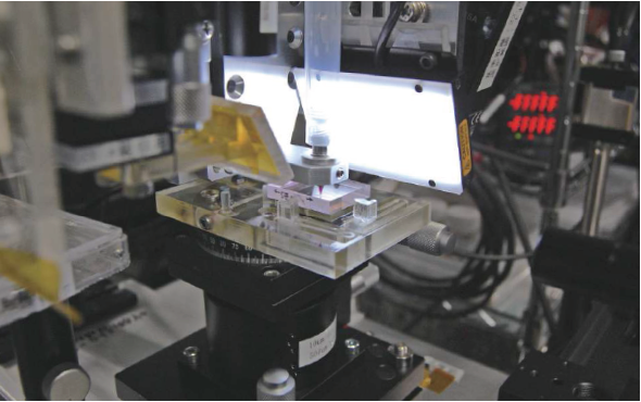 Fig. 9はPDMSチップへの組み込み手順を示す。PDMSチップを作製するモールドマスターとしてはSU-8 3035(マイクロケム)を用いてSiウエハー上に作製し、流路断面サイズは60 µm□とし、屈曲のないストレートのパターンを用いた。これに作製したレーザー付きビーム成型フィルムとクリーブした石英光ファイバ(125µm径、105µmコア)をそれぞれ独立でアラインメントした後、PDMSを接合部に投入してアラインメントを調整しつつ固定を行なった。レーザー出射光が流路位置にあるSU-8に照射するアラインメント調整を行い、レーザー出射部と流路の距離は60〜70µmに調整して固定した。固定後全域にPDMSを注入し、チップを完成させ、固化後にモールドマスターからリフトオフしてPDMS薄膜で蓋をしてチップとした。PDMSには室温硬化型高精細PDMS(信越石英,SIM-360)を用いた。