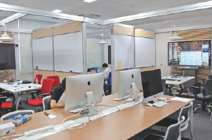 ▲ 九州大学大学院 国際博士課程教育リーディングプログラム: 高精度3DCAD、3Dプリンタ、i-Pad等を設置し、実際に分子のモデルを作ったり、デバイスのモデルをつくるなどして研究分野の異なる学生同士のブレーンストーミングを推進している。IT関係の設置、プログラムの構想には興先生も大きく貢献している。