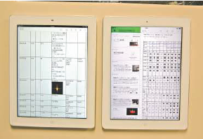 ▲タブレットを利用したペーパーレスな情報共有システム: 各研究者のデータが一括管理されており、PCとも無線でデータが共有できている。