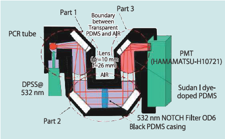 Fig.1 に示す様なPDMS をマトリクスとする光学システムを実現するには、(1)高い減光性の遮光壁・光トラップ、(2)集光構造 (3)波長フィルターなどを自在に配置することがまず必要になる。PDMS は固化後の追加工が困難であるため、3Dプリンター(Agilista-3000, Keyence)で出力した最適設計済みのアクリル型からPDMS を重合転写して施した。(1)については使用した高精度PDMS(SIM-360, 信越化学)にカーボンブラックコンパウンドを分散させ、導光PDMS層や吸光PDMS 層を埋没・接合させることにより遮光壁を構築した。この反射防止遮光壁では、短い吸収長(14µm)と、低い境界反射散乱率10-3 が実現できている。これにより外部からの光雑音や多重散乱による迷光を低減でき、システム全体の小型化が可能となった。(2)では球面型の埋め込みによるレンズ様面を配置した。(3)についてはSudan 色素の乾式含浸分散による532nm 吸収PDMS フィルターによりOD5 を得た。