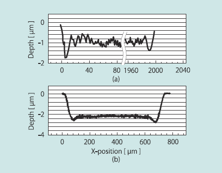 微小ストライプの描画後固化において、低粘度溶液はマランゴニ対流が支配的になり、断面プロファイルがM字型に、高粘度溶液では∩字型となる。しかし、ペン描画法では、導波路の屈折率制御にも利用するメタクリル酸2-ヒドロキシエチル(HEMA)との共重合プレポリマーのブレンド比率を調整することで、両者の中間点の台形型の断面プロファイルを得ることが可能である。この場合、導波路の中央部分には厚さの変化がないフラットトップとなり、良好なレーザースペクトルを得ることができる。