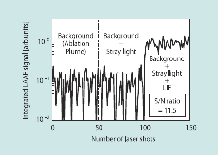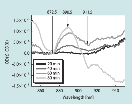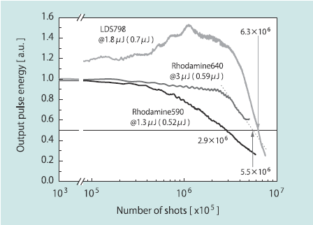 蛍光測定光源用レーザーとしてもう一つ重要な条件として、長波長側の背景光成分の低減がある。励起された蛍光色素の発光波長と同じ波長域のレーザー光成分は観測用フィルタでカットできないためDFBレーザーにおいてどの程度抑えるかが重要である。発振波長よりもおいてどの程度抑えるかが重要である。発振波長よりも10nm長波長側の線強度は通常の色素レーザーでは10-3程度の抑制率であるが、色素濃度を下げるあるいは色素の蛍光波長の長波長域での発振用いることにより,2 x 10-4程度まで低減することができている。