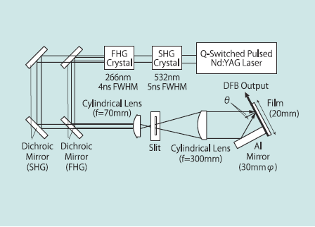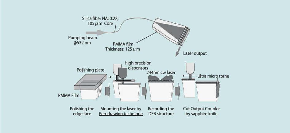Fig. 8に設計した組み込み型集積レーザーの概念図を示す。PMMAフィルム(125µm厚)を用い、光ファイバをこれに結合してビームを一方向にのみ広げるビーム成型フィルムを発案した。Shaperの端面を光学研磨し、この上にペン描画法により屈折率差を小さく設計した三層を積層描画した。なお、コア膜厚を安定させるため、クラッド層は125µm幅一杯に、コア層は60〜100µm幅に抑え、2層描画後にDFB構造を記録後、第3層をコートした。このように幅125µmのエッジ領域に同系ポリマーを3層積層することは従来のスピンコート等では不可能であり、ペン描画により初めて可能となったと言える。ポストアニール後、ウルトラミクロトーム(Sorvall社、UltraMicrotome MT-1)を用いてレーザーの出射面を作製した。各導波路の屈折率制御は共重合ポリマーp(MMA1-x:HEMAx)で主に行い、屈折率の校正はプリズムカプラー(メトリコン社、Model2010)により波長633 nmに対する実測値を元に行なった.