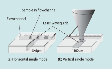 マイクロフローサイトメトリーにおける流路の断面寸法は60〜100µm程度が一般的で、ここにレーザーを近接照射する際にはビーム幅はこれらよりも細い30µm以内に抑えるのが理想的である。Fig. 3に、レーザー導波路を組み込んで直接励起光を流路内に結合させる時、考え得るアラインメントを図示する。流路を維持するためにポリマー素材では隔壁の厚さが数10µm以上必要であり、そのため、レーザー出射部から50µm程度伝搬したビームが流路と鎖交した時のビーム幅が分解能を決定することになる。よって、レーザー導波路の組み込み向きはシングルモードの閉じ込め方向を流路の流れに平行に配置する(a)と、垂直に配置する(b)で異なる。