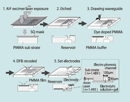 まずはPMMAのプロセスのみを利用した単純な流路チップへの組み込みを行った。作製の容易な配置(b)をここでは採用した。既にエキシマーレーザーのマスク露光によるレジストを用いないプロセスを用い、チップの作製とレーザーの組み込みを行ったプロセスをFig. 4に示す7)。 KrFエキシマーレーザー(Lambda Physik、COMPeX 110)で石英マスクを通してPMMA基板を露光し、ウエットエッチングで深50µmのレーザー用溝と、深さ90µmの流路溝を作製する。その後、ペン描画により、クラッド層を描画し、その上にレーザー層を作製した。レーザー層は色素の添加により屈折率が0.004程上昇することを利用して導波路を構成している。レーザーは右下のように流路の高さから見て中央に配置されている。描画で作製したチップでは導波路端でレーザーが乱されるため、この部分には屈折率をそろえたp(HEMA:MMA)を埋めることでビーム散乱を抑えた。DFBを作製後、電極をリザーバーに取り付け、電解質とゲルを流路に詰めた。
