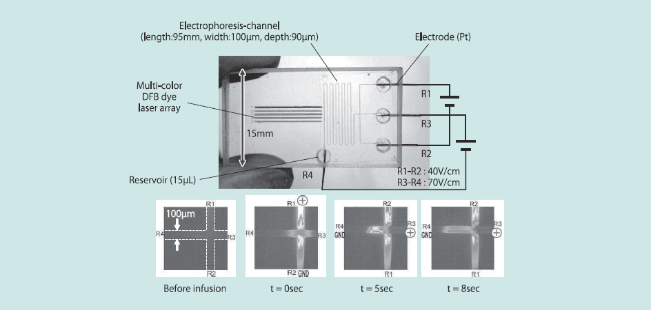 Fig. 5は作製したチップの外観である。流路設計は屈曲させてチャンネル長を95mmまで伸ばし、流路の最後の部分には色素として、rhodamine590、pyrromethene567、LDS722、LDS798の4種類の色素をドープしたレーザーを組み込んだ。それぞれの発振波長は590、600、580、690、790nmである。4つの15 µLのリザーバーには白金電極をセットし、R1にNileblue690等の色素を注入後、リザーバーR1-R2間に40V/cmの電圧をかけて十字点まで導入後、R3-R4に70 V/cmをかけてFig. 5下のように電気泳動で試料を切り出した。