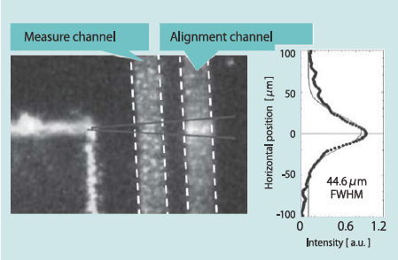 最後に、色素レーザーと流路間のアラインメントを行なうため、流路に流れる色素から蛍光を観測している様子をFig. 12に示す。右の流路は校正用の流路で、左は測定用である。標識色素Cy5®とスペクトル特性が類似している色素として、1,1,3,3,3',3' hexamethylindodicarbocyanineiodide(HIDCI)水溶液を使用して測定を行った。校正用流路での蛍光幅は38µm程度となっている。
