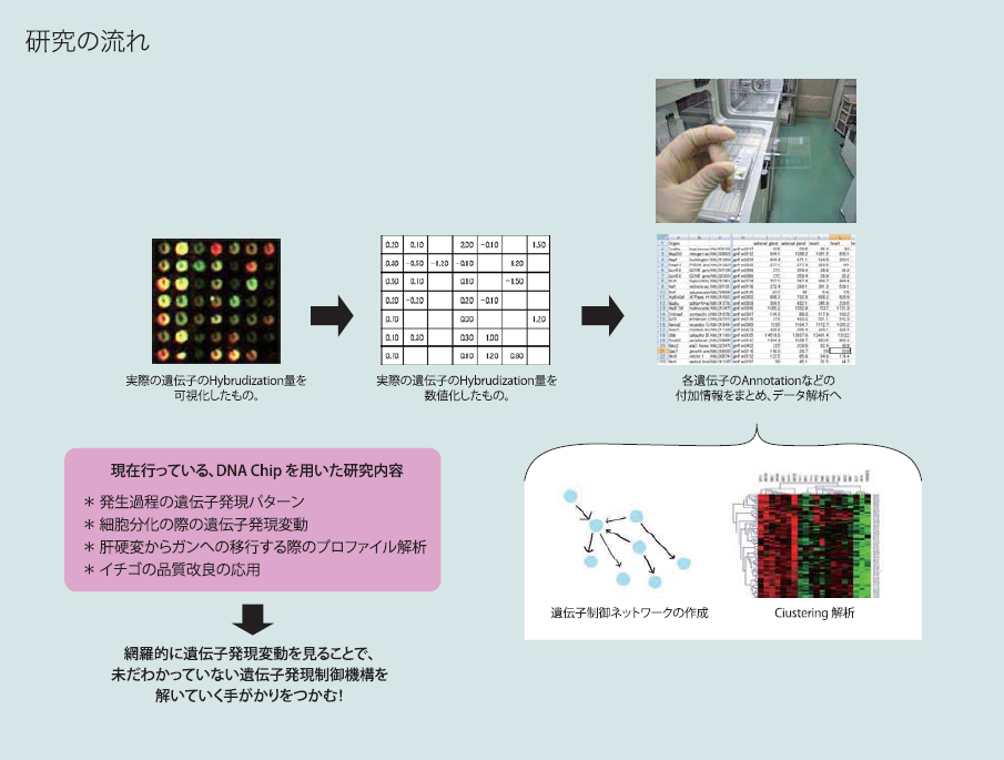 マイクロアレイ法は、ガラスなどの基盤上に数千から数百万種類のDNAを固定し、ハイブリダイゼーションの原理を利用して解析することにより、遺伝子の存在、動態、変異、発現状態などを測定する方法です。これにより、生物の持つ全ての遺伝子の動的挙動を一回の操作によって効率的、また、定量的に計測することが可能となります。この結果を解析することにより、様々な生命現象(発生、分化、増殖、癌化、老化など)における遺伝子発現の制御回路を作成することが可能であり、ひいては、医学分野、物質生産分野での効果的な応用へと広がる 第一歩となると考えられます。