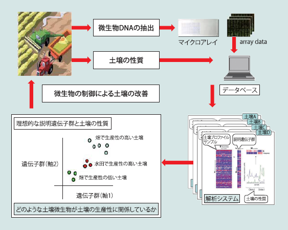 近年、土壌、海域などの自然環境や皮膚、腸管内などの環境中に生育する生物群(微生物叢)のDNAを解析するメタゲノム解析が行われています。本研究室では、微生物叢にどのような種類の微生物が生息しているかを調べるためのDNAチップを開発し、さらに最近では次世代シーケンサーを利用したメタゲノム解析によって各種環境(土壌、海域、腸管内など)に生息する微生物群を同定し、微生物叢及びその性質と環境との関係を明らかにすることを目的とした研究を推進しています。この研究は、様々な応用面が期待されていますが、主に、農産物と土壌環境、海洋生物と海域環境などに焦点を当てた研究を進めています。