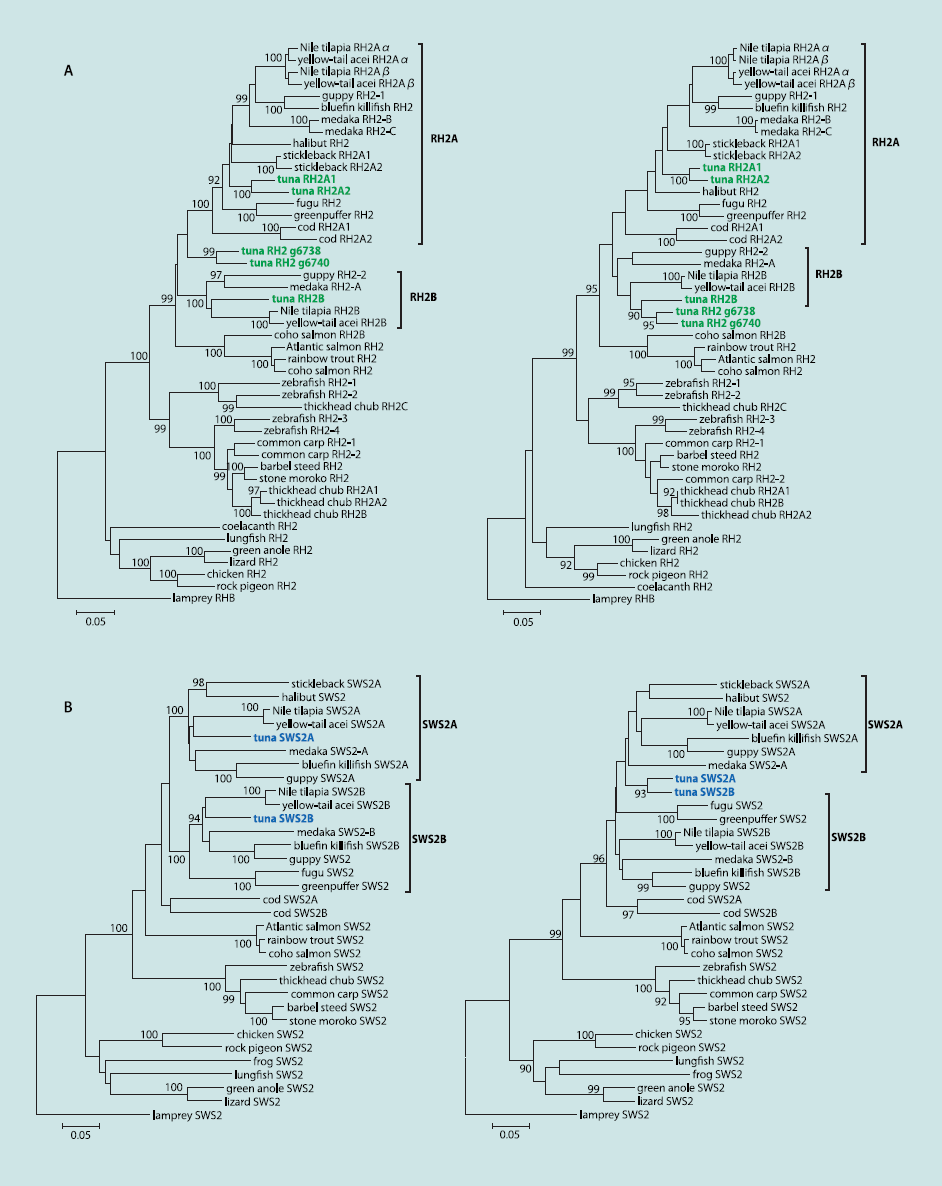 Fig. 2. Phylogenetic trees of green and blue pigment genes. Numbers at branches indicate the bootstrap probabilities (≥90%) with 1,000 replicates. (A) Treesof green pigment genes. Tuna RH2 genes are shown in green. Note that the previously named RH2-A/B genes of medaka do not correspond to cichlid RH2A/B,and the tuna RH2A/B correspond to the cichlid genes. The trees were constructed by using full sequences (Left) and C-terminal sequences (Right), respectively.(B) Trees of blue pigment genes: full sequences (Left) and C-terminal sequences (Right). Tuna SWS2 genes are shown in blue.