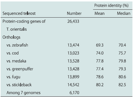 Genomic data from the six teleosts, zebrafish (Danio rerio),cod (Gadus morhua), medaka (Oryzias latipes), greenpuffer (Tetraodonnigroviridis), fugu (Takifugu rubripes), and stickleback (Gasterosteus aculeatus),were downloaded from the Ensembl database (Release 61). All-vs.-all BLASTPwas performed among the seven teleost genes (Ensembl fishes and tuna)with an E-value < 10−10. An orthologous gene pair was defined as one reciprocalbest hit. Each of the core genes conserved among seven teleost fisheswas defined as the gene set in which any pair was defined as orthologous.