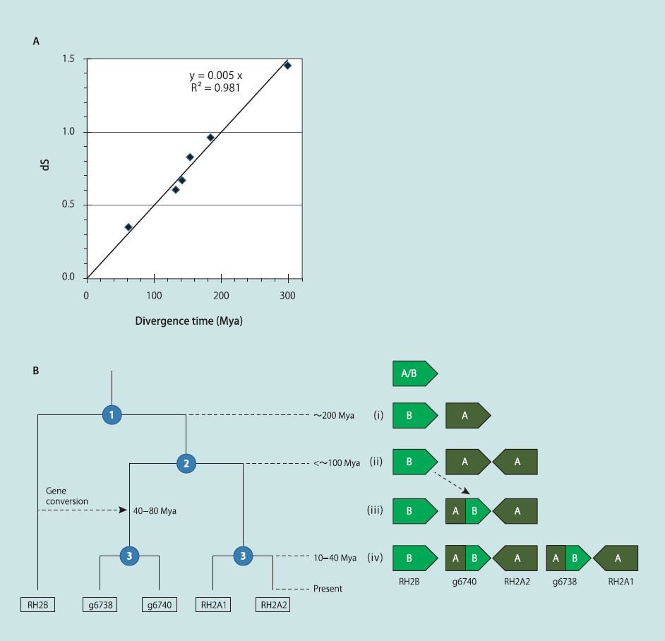 Fig. 3. Calibration of divergence time among teleosts and evolutionary scenario of green pigment genes in T. orientalis. (A) The relationship betweendivergence time and the synonymous substitution rate (dS). The divergence times are based on previous studies (Table S6). The mean dS values werecomputed by using 4,991 of 6,170 core genes among seven teleost genomes. (B) A proposed evolutionary pathway of tuna RH2 genes. Each node witha number in the dendrogram (Left) indicates a duplication event. Right shows a diagram of the changes to the RH2 locus structure during the course ofevolution. The duplication times were estimated by the regression formula computed in A.