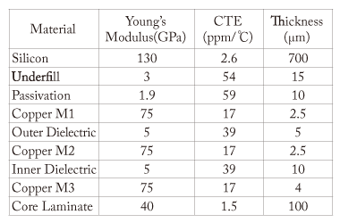 Table 1. Material properties used for low CTE ultra-thin interposer warpage analysis modeling