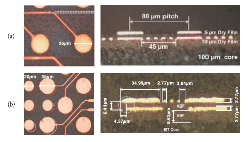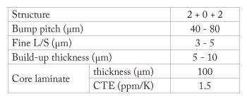 The RDL vehicle targeted 3-5μm fine lines on the both 5μm and 10μm dry film build-up dielectrics at 40-80μm bump pitch on ultra-thin low CTE core laminate. The design concept and specifications are shown in Fig. 4 and Table 2.
