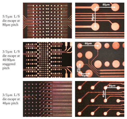 Fig. 6. SAP patterned 3-5μm fine line escape routing on ultra-thin dry films.