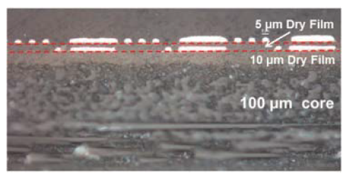 No voids were found during the lamination of the 5μm dry films onto the thin inner metal layer, and good surface planarization was achieved on each dry film RDL layer.