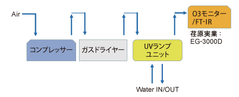 図1に測定系の概略を示す。測定はオゾン発生器であるUVランプユニットの出力に測定器を直接接続して測定した。オゾン濃度計は紫外線吸光式、NOx測定にはFT-IRを使用した。
