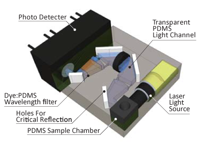 ● PDMS based optical channel and light blocking system for laser induced fluorescence (LIF) and photo absorption (PAS) type were prototyped.
