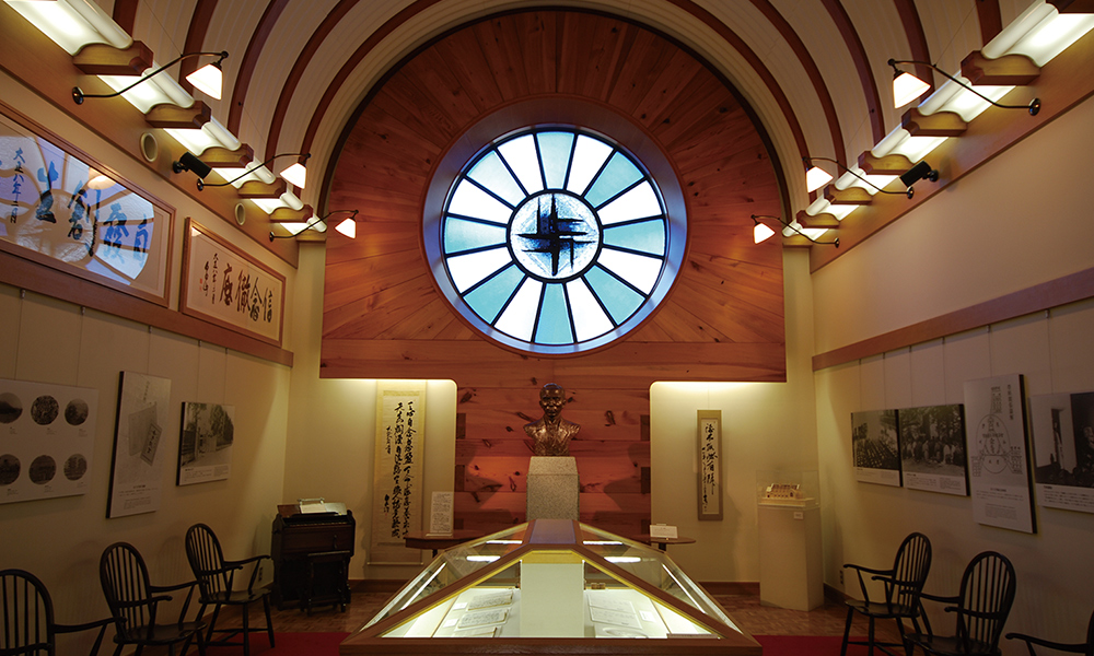 ▲ 成瀬記念館:創立80周年記念事業の一環として、1984(昭和59)年に竣工。正門入って左手に建つ赤煉瓦のロマネスク調の建物です。本学の創立者 成瀬仁蔵の教学の理念と学園の歴史を明らかにし、広く女子教育の進展に寄与することを願って設立された。アーチ型の鉄の扉を押してロビーに入ると、そこにはステンドグラスを通した光が柔らかに満ちています。大きな節目のある厚みをもった木材と、白い壁で構成された館内は、学園内で最も静謐な空間でもある。