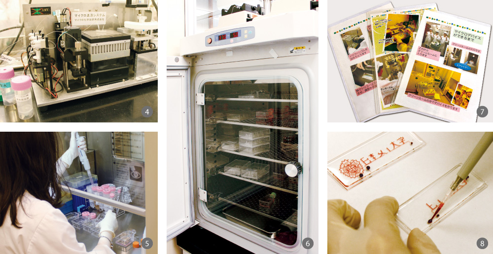 ▲ ④がん遺伝子の検出に用いるマイクロ送液システム ⑤培養細胞の継代を行っている様子 ⑥培地をCO2インキュベーター内にあるマイクロデバイスに供給しながら細胞を培養 ⑦女子学生ならではのユニークで分かりやすい手順書 ⑧日本女子大学のロゴの形に露光することで、ロゴマークの入ったマイクロチップを作成