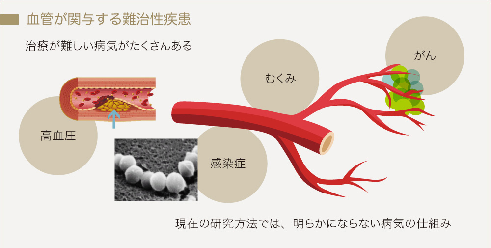 さらに医学部の先生方と話をする機会に、治らない病気の主な原因として血管が関与しているものが多いということが分かりました。