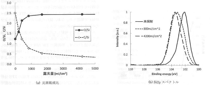 次に、Xeエキシマ光照射後のPDMS表面のXPS分析をおこなった。XPS分析装置への試料導入時間が必要であるため、分析は光照射をしてから約30分後に行い、またXPSの検出角度は45°とした。検出された元素はSi、O、Cのみであり、Si2p、O1s、C1sスペクトルを用いてそれぞれの元素の定量分析をおこなった。Siで規格化したO及びCの元素比率を図3(a)に示す。1000mJ/cm²にかけてOが急激に増加し、ほぼ同時にCが減少していることが分かる。また、最大値で規格化したSi2pスペクトルを図3(b)に示すが、元々102eV付近にあったピークが露光量の増加とともに高エネルギー側にシフトし、最終的には103.5eVまでシフトした。これはSiに結合するO原子の数が増加したためと考えられ9.13.14.)、上述のC/Siの減少及びO/Siの増加は、主にPDMSの中のSi-C結合がSi-O結合に変化したものと考えられる。またPDMSに対してXeエキシマ光やO2プラズマを照射すると、表面が酸化されてガラス状のネットワークを形成することが知られている。11.~13.) ①純粋なPDMSの元素比率はO/Si=1.0であり、②完全にガラス状のネットワークを形成した場合(SiO2)にはO/Si=2.0、③CとOが全て置換した直鎖シロキサンではO/Si=3.0となるが、図3(a)では露光量の多い領域でO/Si=2.5程度となっており、主に②及び③が混在した状態になっているものと考えられる。文献9.10.)によるFTIR-ATRの測定結果からはOH振動ピークが検出されており、Siに結合したO原子はSi-OH(シラノール)の形になっているものと推測する。前述の純水接触角の低下はこうしたSi-OHの生成による、表面自由エネルギーの極性成分の増加に起因するものと考えられる。