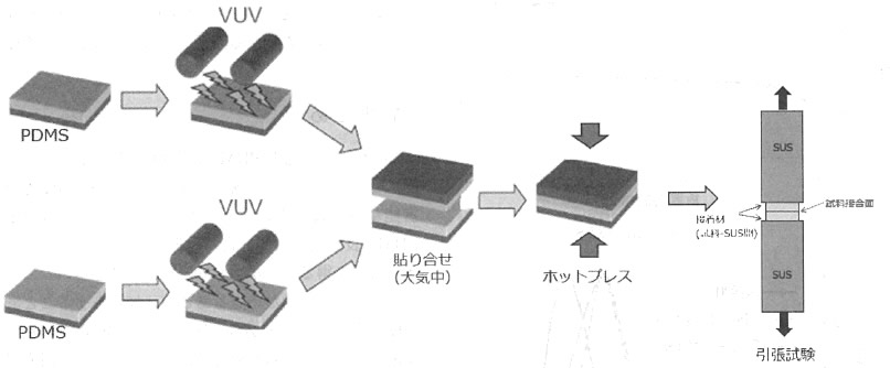 Xeエキシマ光をPDMSに照射することによって、表面に物理的なダメージを与えることなくSi-OH等の酸化官能基を形成することができる。このように活性化したPDMS表面同士を向い合せ、貼り合せることによって強固な接合を得ることができる。接合のメカニズムについては未だ分かっていない点もあるが、加熱をすることで接合強度が向上することから、接合界面でSi-OHの脱水縮合反応が進行しているものと考えている。また、露光量が大きすぎると材料を過度に劣化させてしまうこと、及び照射後の引き置き時間が接合強度の大きく影響することに注意する必要がある。