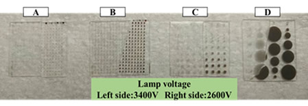 電子ビーム(EB)蒸着法により,基板温度RTで膜厚60nmのa-Ge膜を20×18mm2の石英基板上に4種類のメタルマスク(MA,MB,MC,MD)を用いて石英基板上にアイランド状に堆積速度0.2nm/sで堆積させた。FLAの照射条件は予備加熱温度400℃、照射回数1shot,ランプ印加電圧2600V,3400Vの条件でそれぞれ結晶化を行った。結晶性評価には,ラマン分光法を用いた。