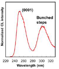 この構造からの発光を,室温における表面カソードルミネッセンス(CL)により評価した.スペクトルの例を図3に示した.二つ(以上)の成分からなる紫外多波長発光が達成されている.表面SEM像とCLマッピングの対応から,図3中に提示したように,短波長発光が(0001)ファセット,長波長発光がステップバンチングした領域に対応していることを確認した.断面TEMとエネルギー分散スペクトロスコピー(EDS)によると,バンチングしたステップ端でGa取り込みが増大しており,それが長波長発光の要因であると考えられる.発表では,マスク構造や井戸幅依存性など,より詳細な議論を行う.