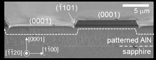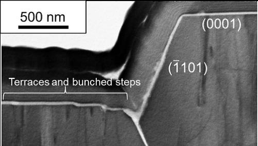 図1に断面走査型電子顕微鏡(SEM)像を示す.主として(0001)面と(1.101)半極性面からなる3D構造が形成されていることがわかる.ただし,トレンチの底のコーナー部分は,図2の透過型電子顕微鏡(TEM)像に拡大した通り,平坦な(0001)面ではなく,バンチングしたステップと(0001)テラスからなることが分かった.このコーナー部分では,(0001)面の成長が,横方向からの(1.101)面の成長により妨げられており,コーナーから離れた(0001)面の成長よりも低速化すると考えられる.それが,ステップバンチングの原因であると推察している.