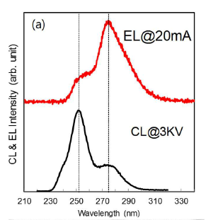 図1に作製した3DLEDの室温,DC駆動時のELスペクトルを示す.250nm帯と270nm帯ピークを重ねあわせたスペクトルとなっており,電流注入による多波長発光が得られた.本発光特性を考察するため,LEDと同条件で発光層まで成長したサンプルを作製し,室温CL評価を行った(図 2(a)-(e)).図2(b)-(e)の各種SEM,CL像は,スケール・場所の関係が一致するように配列されている.(a)のEL/CLスペクトル比較から両者のピーク波長は一致し,その起源は(b)-(e)の比較から250nm帯がc面全体から,270nm帯が溝端部のバンチトステップからの発光であり,[1]同様バンチトステップを利用した多波長化であることが確認された.発表では,AlN3D構造上のAlGaN成長機構など,より詳細な議論を行う.