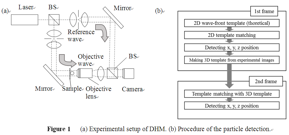 Off-axis DHM (UDHM-01, Ushio Inc., Japan) in Figure 1 (a) consists of interferometer, laser and objective lens. 2D interference fringe patterns were recorded on a camera and phase information was reconstructed numerically [2]. Figure 1 (b) shows the procedure of the particle detection method. The positions of particles were determined by template matching. In the first frame, the position of the particle was detected using the theoretically generated 2D wave-front template. After detection, surrounding experimental phase images were used as a 3D template of the next frame.