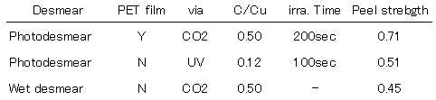 Table 1 shows the peel strength of each condition. Conventional process means the peel strength data of a Wet desmear using KMnO4 followed by a dry seed layer with Cu plating. The peel strength of the Photodesmear with PET film for CO2 laser via processed panel was 0.70 kgf /cm. The peel strength of the Photodesmear without PET film for UV laser via processed panel was 0.51 kgf /cm, which suggests sufficient adhesion between the plated Cu and underlying dielectric surface and is higher than wet desmear with dry seed layer. Because there is not surface damage with the strong chemical solution, peel strength is improved by Photodesmear process.