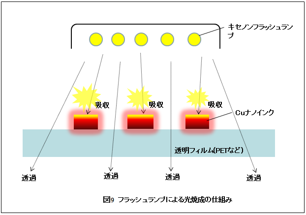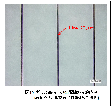 Cuナノインクはインクジェットやグラビア印刷等でパターン形成し、一定時間の熱乾燥後金属粒子の結晶化を促す為の焼成が必要となる。このCuナノインクの焼成には一定の高温加熱が必要である為、配線を形成するベース基材の耐熱温度が低い場合やフレキシブル素材は焼成時の基材変形を抑える技術が必要となる。これを実現するのがキセノンフラッシュランプによる光焼成である。キセノンフラッシュランプは図2で示すとおり紫外域から赤外域まで幅広い波長の光を出力するため、Cuの吸収帯にも適合している。樹脂フイルムなどのベース基材は透明性が高いものが多く、可視領域の光を透過する為フラッシュランプ光によるベース基材の温度上昇を抑制しつつ、導電性金属インク部を選択的に加熱できる(図9参照)。導電性金属インクのパターン幅や厚み、ベース基材の組成により発光強度や発光時間を制御する必要があるが、フラッシュランプの発光時間はμ秒オーダーで発光制御が可能である。図10に導電性金属インクの光焼成例を紹介する。図はガラス基板上での焼成例であるがこの他にポリイミドフイルムや最近では耐熱性の低い樹脂フイルムの代表例であるPETフイルム上でも焼成条件が見出せている4)