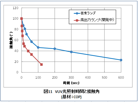 VUV光による配線パターニング技術はプロセスの認知度や成熟度が不十分である。その背景としてVUV光による改質時間が長かったことが挙げられる。我々は光源メーカーとしてこれまでこのVUV光源の高出力化に取り組んできており、2015年の寄稿時から比較して5倍の光出力の光源開発に成功した5)。図11に示すとおり光出力の向上により基材の改質時間を大幅に短縮出来ることも分かってきた。