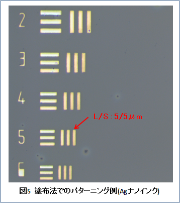 ここで我々が提案する選択的表面改質による配線パターニング技術におけるVUV光による表面改質の原理とプロセスフローの一例をそれぞれ図3.4に示す。VUV光により基材表面の有機物の分子結合が解離され、わずかに粗化される。これと同時にVUV光は光路中に存在する微量な酸素分子を励起し、酸素ラジカルを生成させる。分子結合が解離された基材表面にこの酸素ラジカルが反応し、親水官能基が生成される。この基材に金属ナノインクを塗布することで、親水官能基が生成された部分にのみ金属ナノインクが選択的に付着し配線形成される。樹脂フイルム表面や有機膜に拡散光型のVUV光源である低圧水銀灯(使用中心波長185nm)やエキシマランプ(使用中心波長172nm)を照射し、親水化や改質反応させる技術は古くから報告されている1)。ここでは平行化されたVUV光をフォトマスクに介すことにより微細な領域の表面改質を実現した。このような短いプロセスで図5に示すような10umL/S以下のパターン形成が可能であり、室温で1umの配線や有機トランジスタ動作を確認した例も報告されている(図6参照)2)。VUV光と塗布法による配線パターニングにはVUV光の積算光量だけでなく導電性インクの粘性や溶媒の選定、塗布する基材表面との表面張力のバランスが重要である。