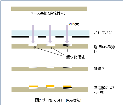 次に、VUV光による選択的表面改質をめっき配線に応用した例を紹介する。平行化されたVUV光を利用して基材表面の微細な領域を選択的に粗化し親水基を生成させるのは塗布法と同様である。めっき法では基材をアルカリ洗浄し、次にパラジウムなどが溶解されている触媒溶液に浸漬させることで、改質部にのみ触媒が含浸される。めっき触媒が含浸された改質部がシード層となり無電解めっきを成長させることで感光性レジストプロセスを用いずに微細金属配線を形成することができる。めっき法の利点は複数の樹脂と金属種が選択出来る可能性があることである。図7,8にプロセスフローとこのプロセスで得たPETフイルム上に形成した無電解Cuめっきメッシュパターンの例を紹介する。樹脂フイルムはPETの他にポリイミド、COPなどが可能である。めっきによるパターン形成がプリンタブル配線かどうかは議論のあるところであるが結局はデバイスを作成する側の選択によるところだと考える。