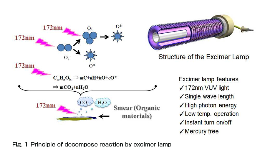 フォトデスミアとは、エキシマランプを利用したデスミア技術である。ランプから発生した172nmの真空紫外線(VUV:Vacuum ultra violet)は大半の有機物の化学結合に作用する。酸素を含むプロセスガス中ではVUV光は酸素分子をオゾンに変化させ、さらにオゾンの分解によって活性酸素を発生させる。このように光、オゾン、活性酸素を有機物に作用させることでスミアや樹脂の有機物を分解する(図1)。次に有機物分解後に残った無機物を純水で超音波処理する工程からなる。