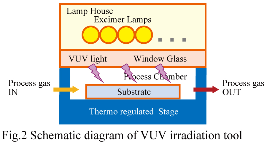 図2はフォトデスミアシステムのVUV照射装置の模式図である。基板は温度制御されたステージに置かれ、上部に専用に設計された高出力エキシマランプが並べられており、光透過窓を介して172nmの光が照射される。プロセスチャンバーは酸素ガスの有効利用と分解物回収のためシールが施されているが、プラズマ装置のように真空引きは必要としない特長がある。