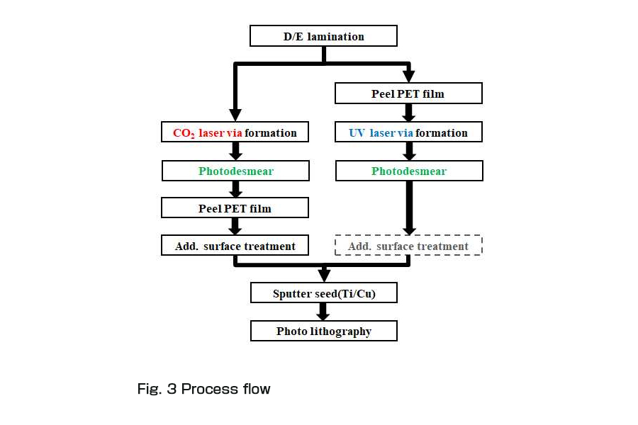 もう一つのフローは従来通り絶縁フィルムのラミネート後にキャリアフィルムであるPETフィルムをはがし、UVレーザーによってCO2レーザーよりもさらに小さいビアを形成するフローである。UVレーザーを使用する場合、ビア底に残留するスミアは極めて少なくなるので、フォトデスミアプロセスで照射するエネルギー量は、CO2レーザー法にくらべて格段に少なくて済む。