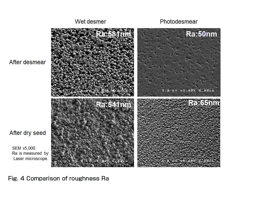 図4は従来のウエットデスミアとフォトデスミアの表面粗さの比較データである。ウエットデスミアでは表面粗さRaが500nm以上になっているのに対し、フォトデスミアでは数10nmに抑えられている。スパッタによるシード層形成後もRaは低く保たれている。このあと、30μmの電解めっきを施した後のピール強度は、フォトデスミア方式の場合0.7kg/cm以上の値を示した(ウエットデスミアの場合は0.4-0.5kg/cm)。このように密着性が高く、平滑な表面は、微細配線を形成する樹脂の下地として必要な要件となる。