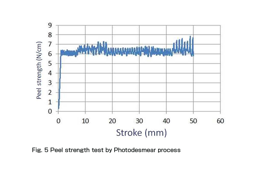 このあと、30μmの電解めっきを施した後のピール強度は、フォトデスミア方式の場合0.6kg/cm以上の値を示した。